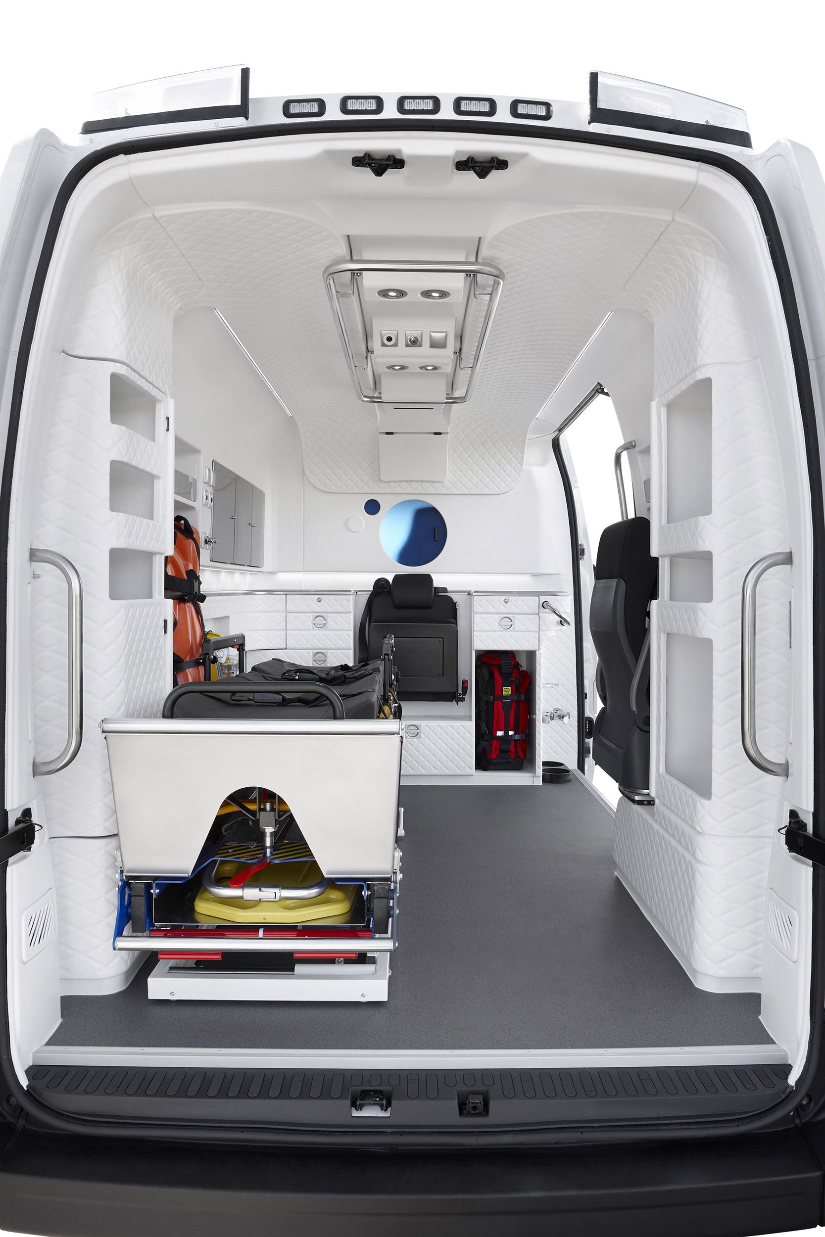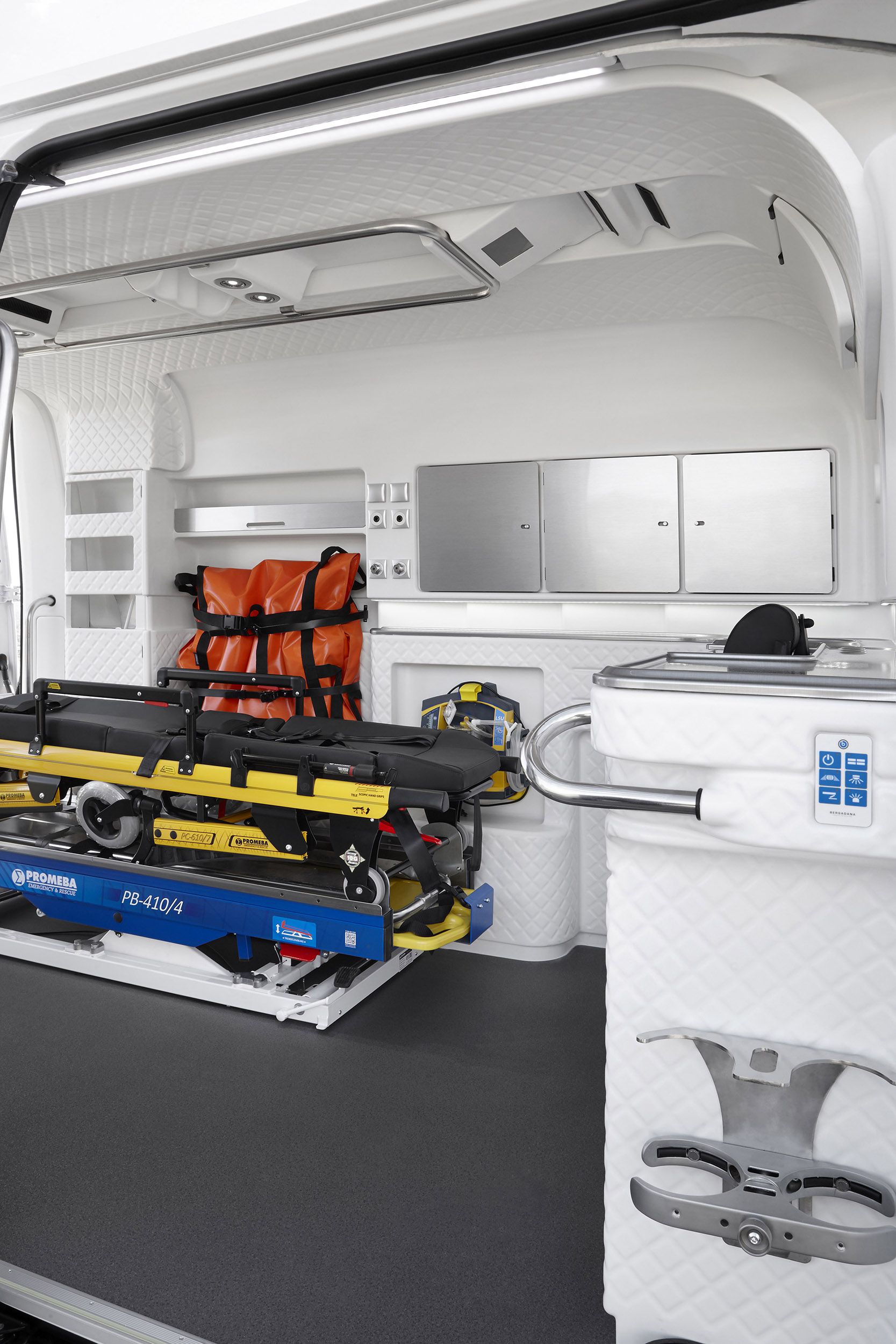 Disseny de l'interior de l'ambulància Absolut. Aquest interior, molt optimitzat i amb un disseny minimalista, confortable i intuïtiu, respon a les necessitats reals del personal sanitari, al mateix temps que dóna un salt qualitatiu en la reducció d'estrès del pacient.